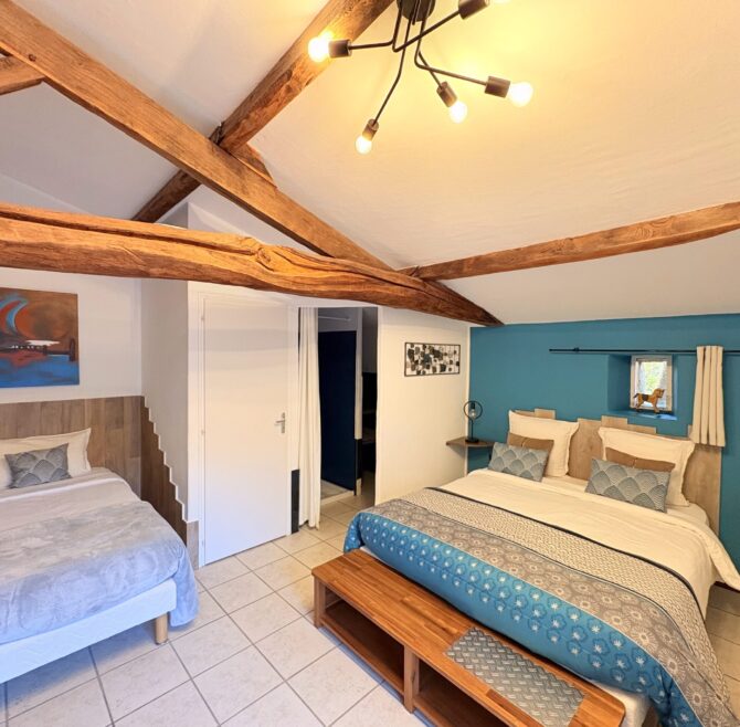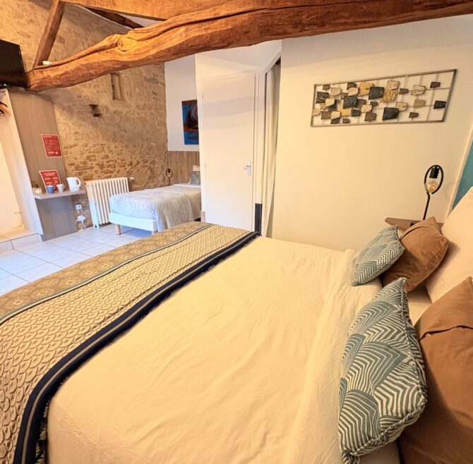 Bienvenue dans notre spacieuse chambre “La Quintaine”, conçue pour accueillir confortablement 3 à 4 personnes.