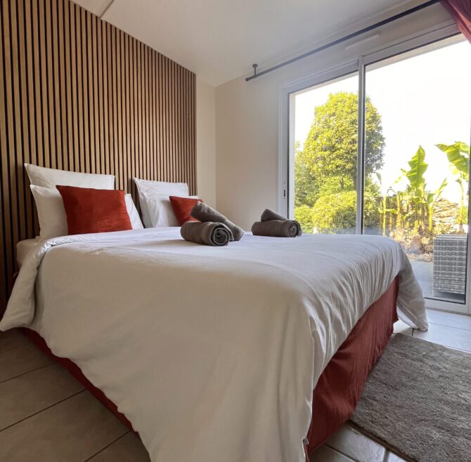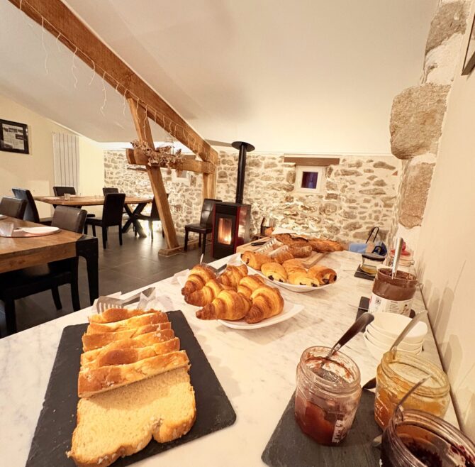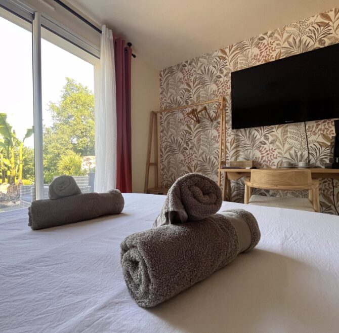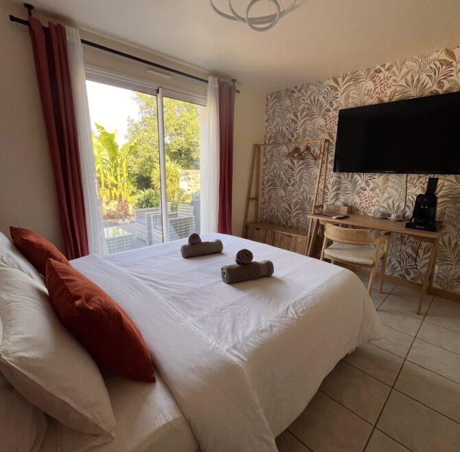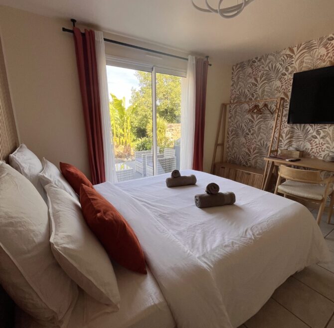 Bienvenue dans notre chaleureuse chambre “Vent de Galerne”, d’une surface de 23m², conçue pour accueillir confortablement 2 personnes avec lit queen size et petit salon.